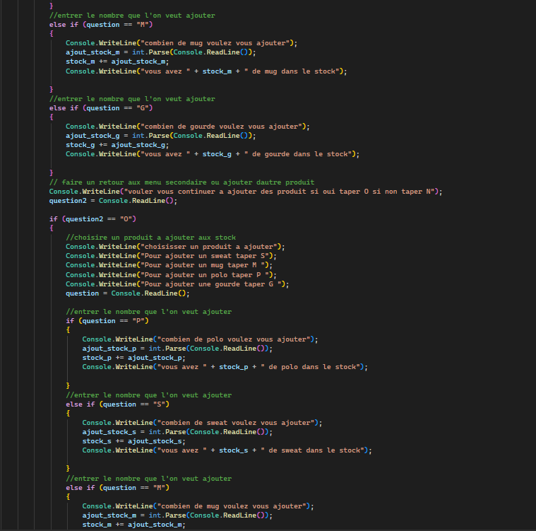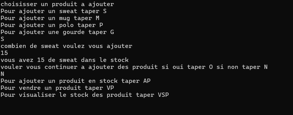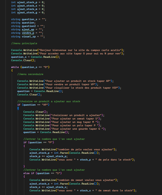 Lors de l’AP6, nous avons travaillé en C# en mode console pour créer un site destiné au Bureau des Étudiants (BDE), dont le rôle est d’animer la vie étudiante et d’organiser diverses activités. Notre mission consistait à concevoir un site de vente de produits personnalisés aux couleurs du campus, comme des sweats, des polos, des stylos, des mugs, etc. Nous avons donc développé un algorithme en C# pour gérer le stock, afficher les prix, visualiser les produits disponibles, et ajouter de nouveaux articles. En résumé, nous avons pu gérer l’ensemble du processus de vente et de gestion du stock, tout en travaillant en mode console.
